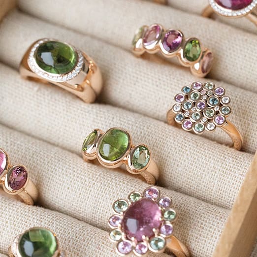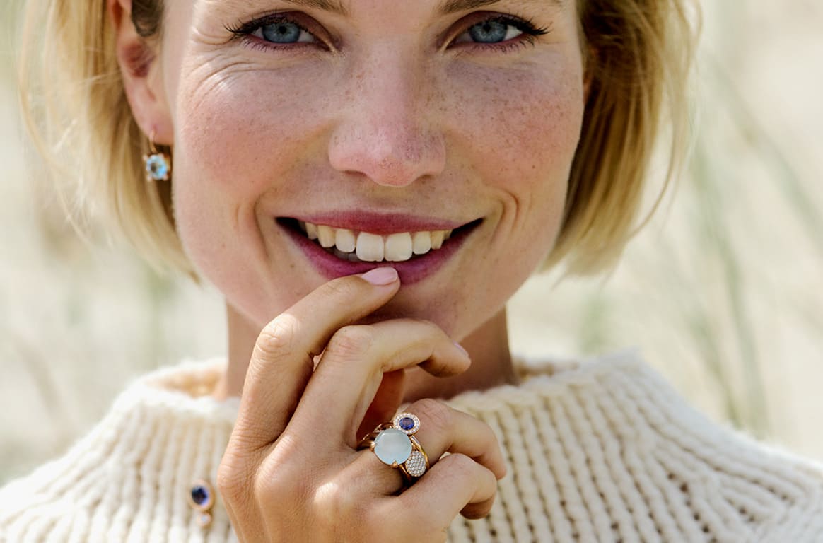 Seltene Edelsteine sind der niederländischen Schmuckdesignerin Helen Bron hier ins Netz gegangen. London Blue Topas, sanftgrüner Aventurin oder rosafarbener Turmalin leuchten auf den minimalistischen Ringen der Kollektion Catch. Und tatsächlich sieht es so aus, als hätten die vier kleinen Krappen sich den Edelstein gerade geschnappt, um ihn nicht wieder loszulassen. Ein toller Fang!