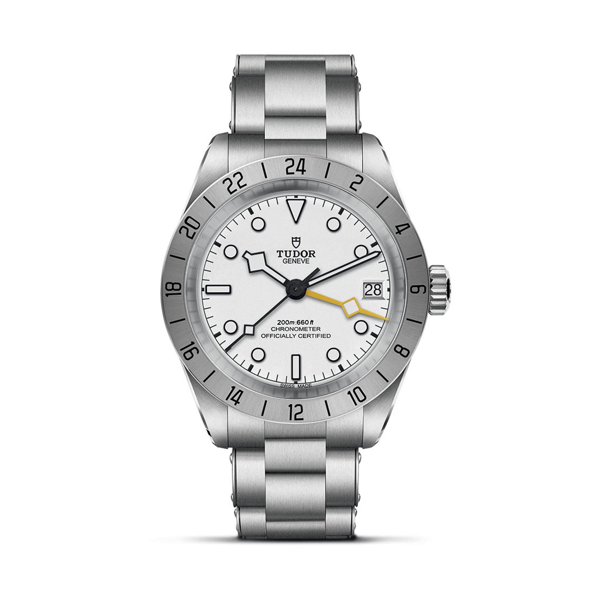 Feststehende Lünette mit 24‑Stunden-Graduierung in satiniertem Edelstahl, Verschraubbare Aufzugskrone in Edelstahl mit TUDOR Rose im Relief