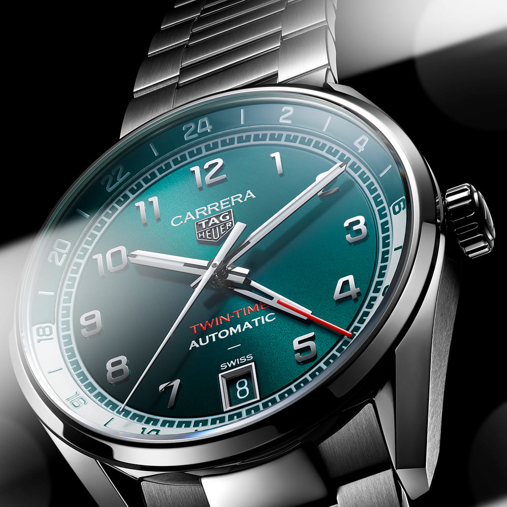 Ein besonderes Kapitel innerhalb der Kollektion schreibt die Carrera Date Twin Time. Ihr Zifferblatt in schimmerndem Petrolblau fängt das Licht auf faszinierende Weise ein. Eine zweifarbige 24-Stunden-Skala und der rot akzentuierte GMT-Zeiger ermöglichen das Ablesen einer zweiten Zeitzone: ein raffiniertes Detail für Menschen, die zwischen verschiedenen Ländern und Kontinenten unterwegs sind. Das neue Stahlband mit Schnellwechselsystem verbindet Eleganz und Alltagstauglichkeit und macht die Twin Time zum stilvollen Reisebegleiter.